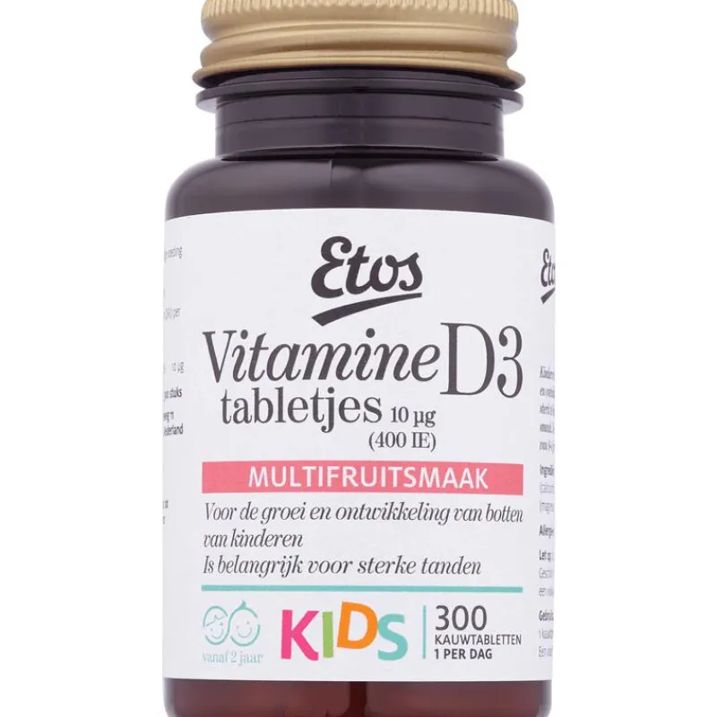 Etos Kids 10 ug Vitamine D3 Kauwtabletten met multifruitsmaak zijn speciaal ontwikkeld voor kinderen vanaf 2 jaar.