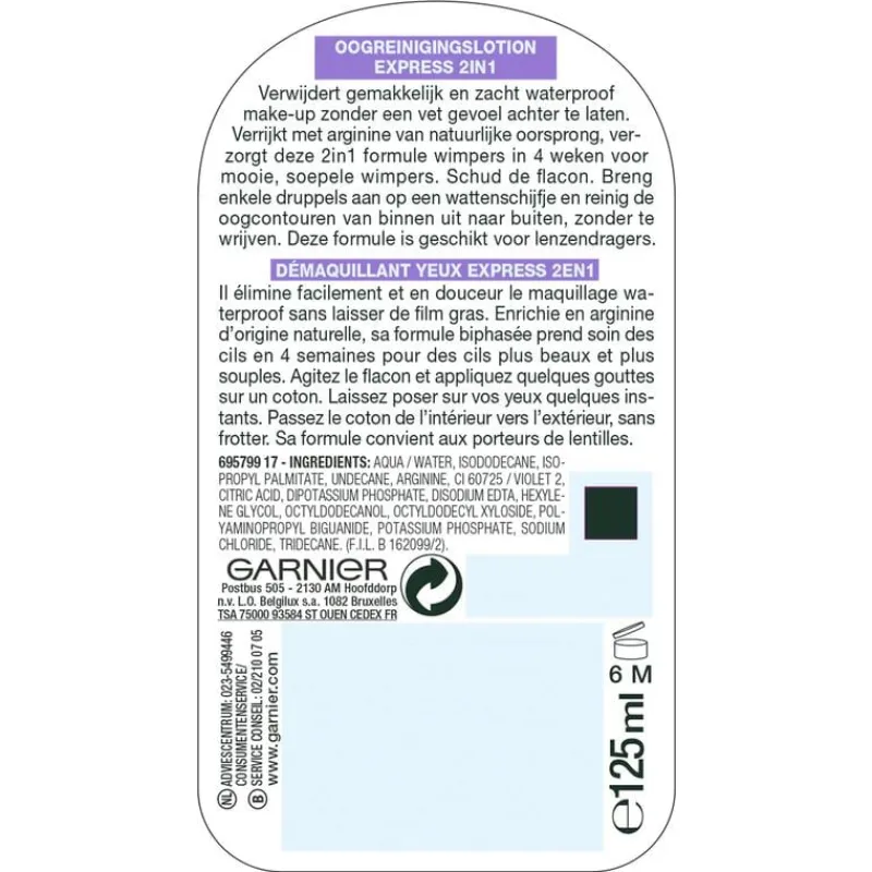 Deze Garnier 2-in-1 oogreinigingslotion is een oogmake-up remover met een dubbele werking. Het verwijdert gemakkelijk en zacht waterproof make-up, zonder te wrijven. Verrijkt met Arginine van natuurlijke oorsprong, verzorgt deze formule wimpers in 4 weken.