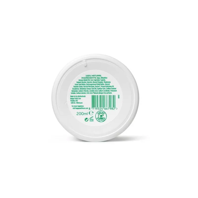 Deze voedende crème is special ontwikkeld voor de gevoelige en droge huid. Het bevat avocado olie , cacaoboter en shea boter die helpen de huid op een natuurlijke manier te hydrateren en te verzorgen. De bodylotion heeft een heerlijk, allergeenvrij parfum dat licht ruikt naar amandel en perzik. Dit product is, net als alle andere producten van Happy Earth, 100% microplasticvrij. De verpakking is gemaakt van gerecycled plastic en Happy Earth wordt geproduceerd in Nederland met groene energie.