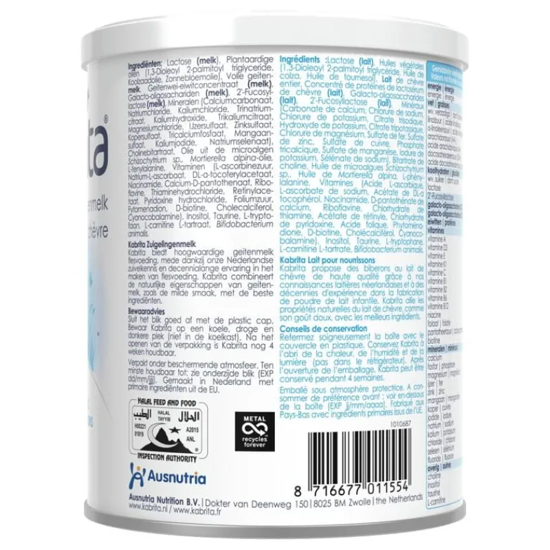 Ingrediënten: Lactose (MELK), Volle geitenMELK, Plantaardige oliën (1,3-Dioleoyl-2-palmitoyltriglyceride, Koolzaadolie, Zonnebloemolie), Geitenwei-eiwitconcentraat (MELK), Galacto-oligosachariden (MELK), Magere geitenMELK, Mineralen (Tricalciumfosfaat, Calciumcarbonaat, Natriumchloride, Kaliumchloride, Trinatriumcitraat, Kaliumhydroxide, IJzersulfaat, Trikaliumcitraat, Magnesiumchloride, Zinksulfaat, Kopersulfaat, Mangaansulfaat, Kaliumjodide, Natriumselenaat), Cholinebitartraat, 2′-Fucosyllactose (MELK), Olie van de microalgen Schizochytrium sp., Mortierella alpina-olie, Fructo-oligosachariden, Vitaminen (Natrium-L-ascorbaat, L-ascorbinezuur, DL-伪 tocoferylacetaat, Calcium D-pantothenaat, Niacinamide, Riboflavine, Thiaminehydrochloride, Pyridoxine hydrochloride, Retinylacetaat, Foliumzuur, Fytomenadion, D-biotine, Cholecalciferol, Cyanocobalamine), L-fenylalaline, Inositol, Taurine, L-tryptofaan, L-carnitine L-tartraat, Bifidobacterium animalis.