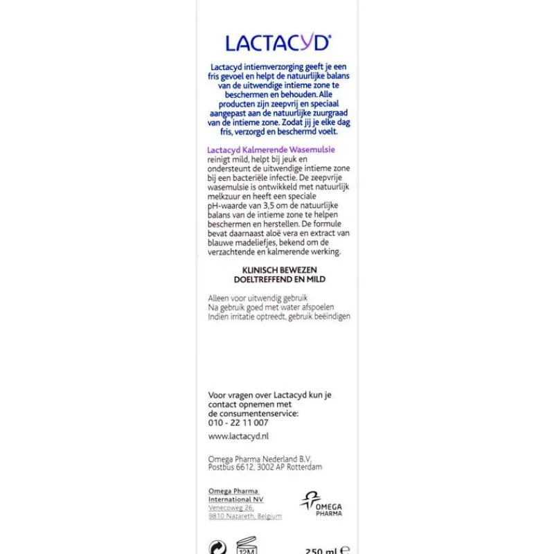 Lactacyd Kalmerende Wasemulsie verzacht en ondersteunt de uitwendige intieme zone en helpt bij uitwendige intieme zonele ongemakken zoals irritatie, jeuk en roodheid. De zeepvrije gel bevat natuurlijk melkzuur en heeft een speciale pH-waarde om natuurlijke bescherming te bieden bij ongewenste uitwendige intieme zonele ongemakken.