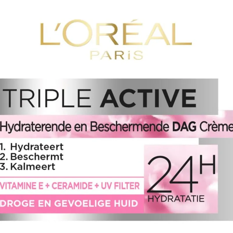 Een droge en gevoelige huid is vaak gespannen en voelt ongemakkelijk aan. Daarom heeft L’Oréal Paris de Triple Active dagcrème voor de droge en gevoelige huid ontwikkeld om de huid intens te hydrateren en te beschermen tegen dagelijkse schadelijke invloeden.