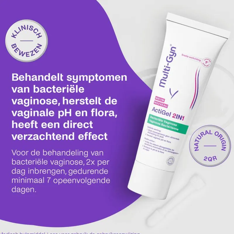 Multi-Gyn ActiGel 2in1 heeft een dubbele werking waarvan klinisch is bewezen dat het bacteriële vaginose (BV) behandelt en de pH-waarde herstelt voor een gezonde vaginale flora. Het verlicht de symptomen van BV vanaf het 1e gebruik. Het geeft een direct verzachtend effect en stopt ongemakken zoals abnormale afscheiding, visachtige geur, jeuk, irritatie en roodheid. Het bevat 2QR-complex dat het weefsel op een natuurlijke manier beschermt tegen schadelijke bacteriën.