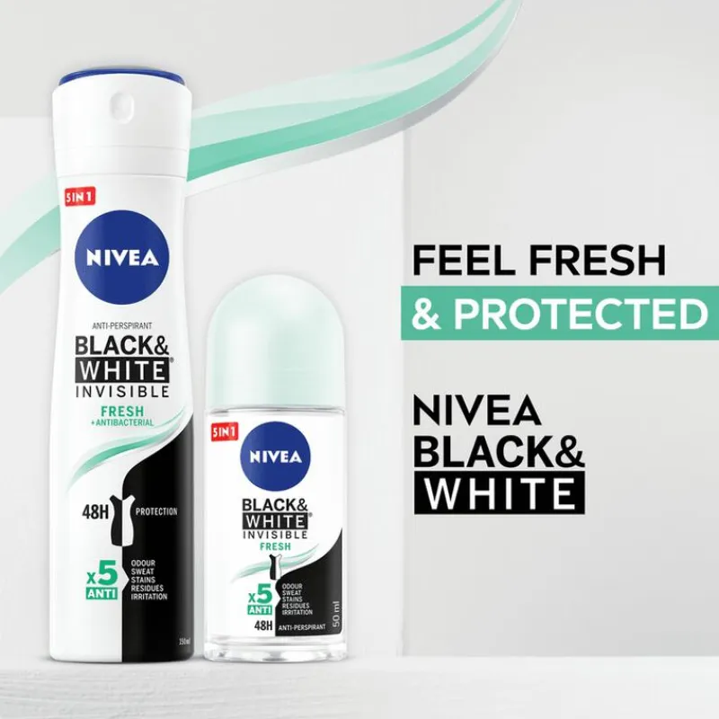 NIVEA Black & White Fresh Anti-Transpirant is de ideale keuze voor de vrouw die op zoek is naar effectieve bescherming én zorg voor haar kleding. Deze anti-transpirant is ontwikkeld met een unieke gepatenteerde anti-vlekken technologie die witte vlekken op zwarte kleding voorkomt en gele vlekken op witte kleding tegengaat. Zo kun je met vertrouwen je favoriete outfits dragen, zonder je zorgen te maken over vervelende vlekken.De formule biedt tot wel 72 uur betrouwbare anti-transpirantbescherming tegen zweet en geuren, terwijl het tegelijkertijd zacht is voor de huid. Dankzij de huidvriendelijke samenstelling, zonder ethylalcohol, is deze deodorant perfect voor dagelijks gebruik. De huidverdraagzaamheid is dermatologisch bewezen, zodat je zeker weet dat je huid goed wordt verzorgd.Daarnaast is de NIVEA Black & White Invisible ook verkrijgbaar in een handige pocket size mini-verpakking. Dit maakt het eenvoudig om je favoriete deodorant altijd bij je te hebben, of je nu onderweg bent, op reis gaat of een drukke dag hebt. Met deze mini-versie geniet je overal van langdurige frisheid, krachtige bescherming en kleding zonder vlekken.