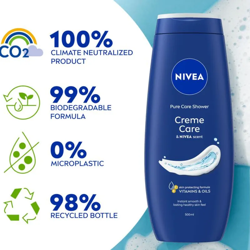 “Ervaar iedere dag een moment van verzorging met de NIVEA Creme Care Douchecrème. Deze milde formule, verrijkt met ingrediënten van de originele NIVEA Creme, hydrateert intensief en geeft je huid een zacht, verzorgd gevoel. De douchecrème is pH-huidneutraal, dermatologisch goedgekeurd en respecteert het microbioom van de huid. Dankzij de 99% biologisch afbreekbare formule* is het ook een duurzame keuze. Ideaal voor alle huidtypes. Breng aan op de natte huid, masseer zacht in en spoel af voor een zichtbaar gehydrateerde huid – elke dag opnieuw.