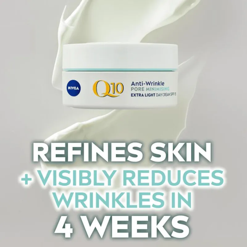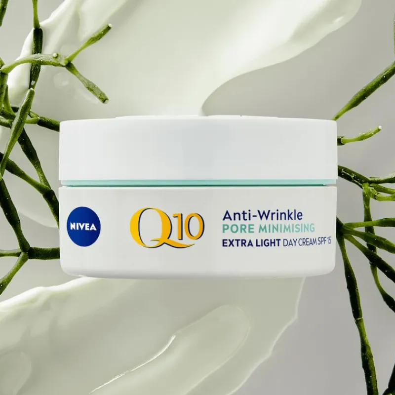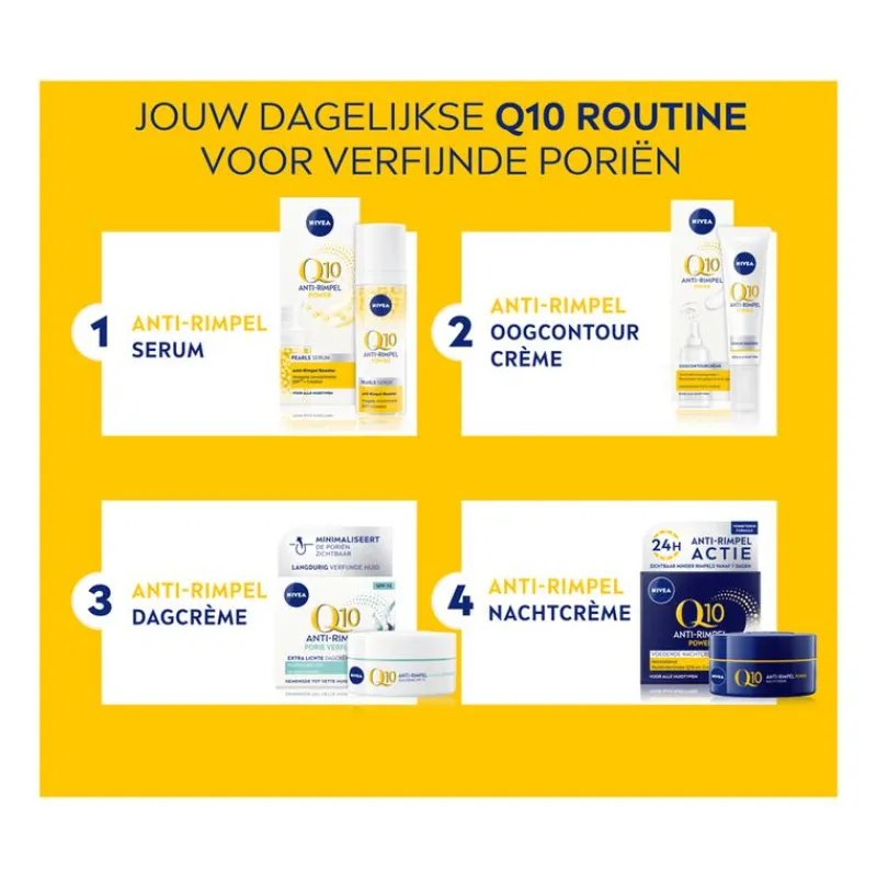 Verzorg de gemengde tot vette huid met NIVEA Q10 POWER Anti-Rimpel Porie Verfijnende Dagcrème. Deze crème trekt makkelijk in de huid en bestrijdt rimpels effectief, zonder een vettig laagje achter te laten. Tegelijkertijd geniet je van diepe verzorging die de poriën minder zichtbaar maakt, voor een egalere teint. Deze anti-rimpelcrème voor vrouwen bevat bovendien SPF 15. Dit beschermt je huid tegen uv A/uv B-stralen die de huid beschadigen en vroegtijdige huidveroudering veroorzaken. Q10 en creatine zijn de krachtige ingrediënten in NIVEA Q10 POWER Anti-Rimpel Porie Verfijnende Dagcrème. Deze formule bevat tot wel tien keer meer creatine dan voorgaande varianten, wat de collageenaanmaak stimuleert voor een stevigere huid. Het algenextract, afkomstig van zeewier, reinigt en balanceert de talgproductie, terwijl het ook de poriën verkleint. Deze antirimpelcrème is speciaal ontwikkeld voor de gemengde tot vette huid, en helpt de huid zacht, egaal en stevig te maken. • Vermindert rimpels en fijne lijntjes • Brengt de vette huid in balans • Maakt poriën zichtbaar kleiner • Met Q10, creatine en zeewierextract • Beschermt de huid met SPF 15