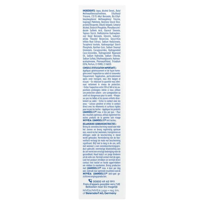 NIVEA SUN Face Luminous Anti-Spot SPF50 beschermt je tere gezichtshuid onmiddellijk tegen UV-stralen. Het voorkomt en vermindert zichtbaar door de zon veroorzaakte vlekken dankzij het gepatenteerde ingrediënt Luminous630. Voor een egale en stralende teint. De lichte en niet-vette zonnecrème zorgt voor een verfrissend effect. De formule is vrij van UV-filters Octinoxate, Oxybenzone en Octocrylene.