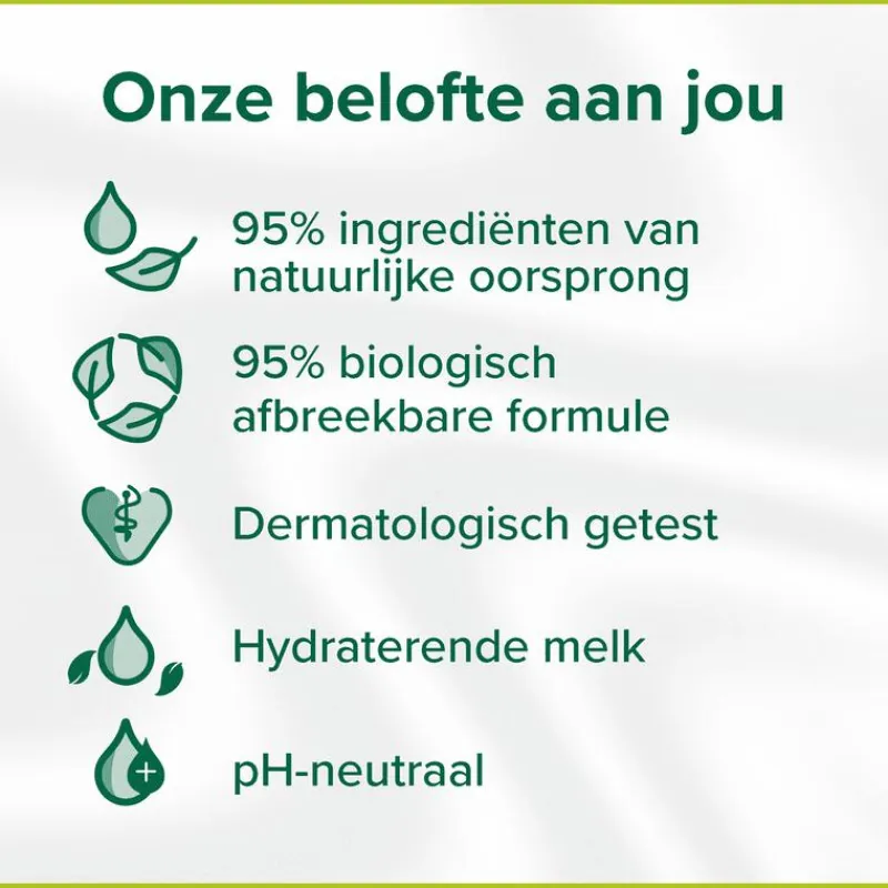 De douchecrème bevat niet alleen plantaardige melk, maar is ook gemaakt met ingrediënten van 95% natuurlijke oorsprong**. De bodywash heeft een voor 98% biologisch afbreekbare formule en zit in een recyclebare fles. De vegan douchecrème is ook dermatologisch getest.