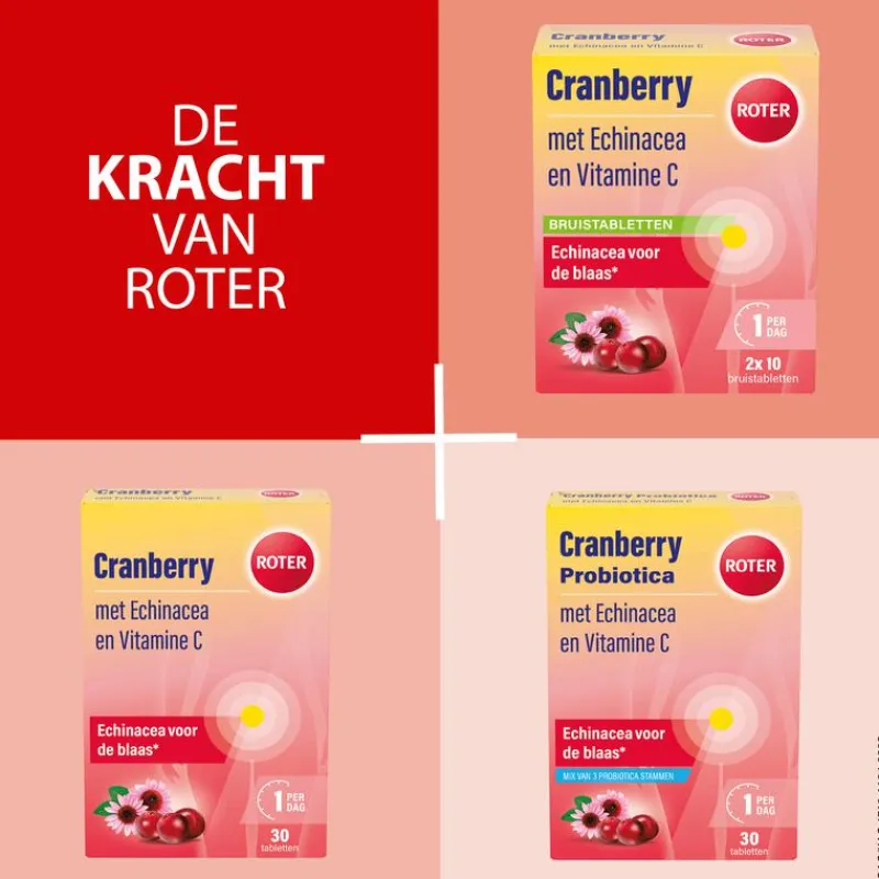 Roter Cranberry bruistabletten is een voedingssupplement speciaal ontwikkeld met Echinacea. Echinacea ondersteunt een gezond milieu in de blaas1. De bruistabletten zijn zorgvuldig samengesteld uit een combinatie van natuurlijke plantenextracten en vitamine C. Echinacea is goed voor de blaasfunctie, het helpt de blaas schoon te houden1. Tevens draagt het bij aan een normale werking van het afweersysteem van het lichaam1. Vitamine C ondersteunt het immuunsysteem en draagt bij tot de bescherming van gezonde cellen en weefsels tegen oxidatieve schade. De bruistablet lost gemakkelijk op in water en heeft een lekkere cranberry smaak.