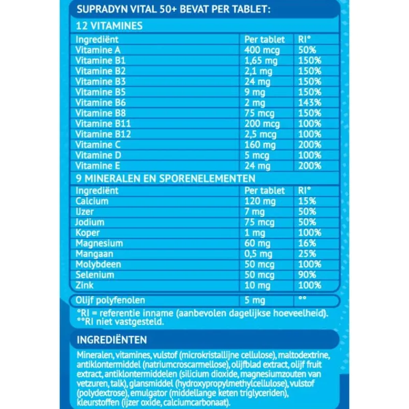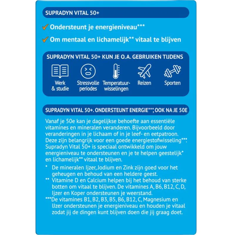Supradyn Vital 50+ bevat een combinatie van vitamines die voorzien in de veranderende behoefte van je lichaam vanaf 50 jaar. De vitamines B1, B2, B3, B5, B6, B8, B12, C, het mineraal magnesium en het sporenelement ijzer ondersteunen je energieniveau en houden je vitaal. De mineralen ijzer, jodium en zink zijn goed voor het geheugen en behoud van een heldere geest. ;Essentiële vitamines en mineralen spelen een belangrijke rol bij de energiestofwisseling. Supradyn Vital 50+ ondersteunt je energieniveau* en helpt je om geestelijk** en lichamelijk* vitaal te blijven. *De vitamines B1, B2, B3, B5, B6, B8, B12, C, het mineraal magnesium en het sporenelement ijzer ondersteunen je energieniveau en houden je vitaal zodat je de dingen kunt blijven doen die je graag doet.;**De mineralen ijzer, jodium en zink zijn goed voor het geheugen en behoud van een heldere geest.
