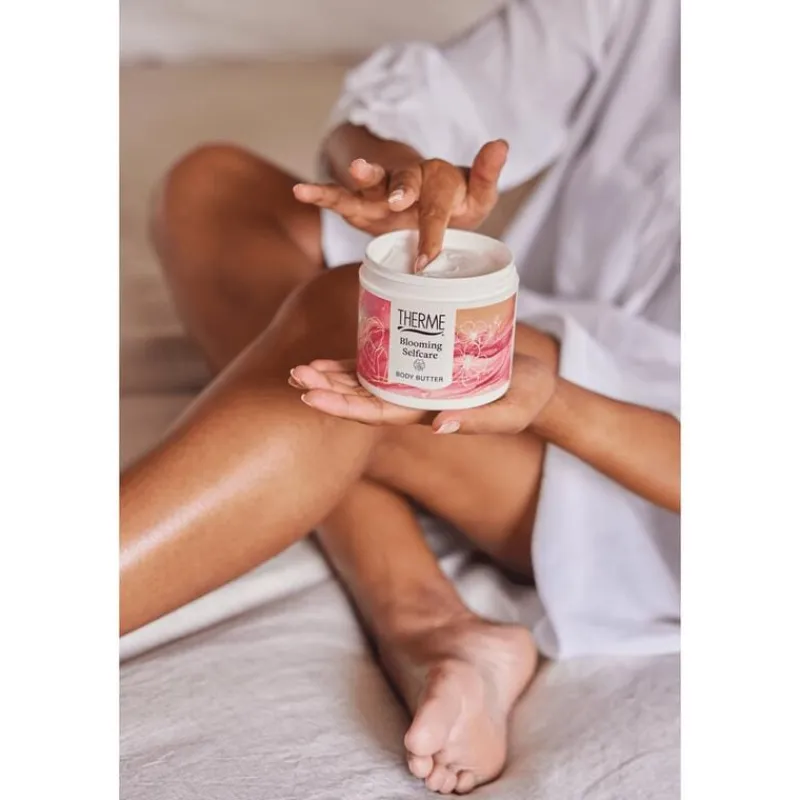 Geef liefdevolle aandacht aan jezelf en prikkel je zintuigen met deze luxe wellness beleving. Therme Blooming Selfcare Body Butter is een rijk voedende crème die de huid intensief hydrateert. Het laat een verzorgend laagje achter en parfumeert het lichaam langdurig. Geniet van de bloemige geur van delicate jasmijn en iris gecombineerd met zoete oranjebloesem en stralende patchouli.