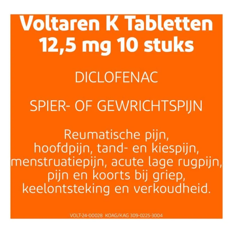 Het werkzame bestanddeel (diclofenac) gaat rechtstreeks naar de pijnlijke plek – voor een snel effect. Voltaren K 12,5 mg is een pijnstiller die ook ontstekingen (zwellingen) vermindert en koortsverlagend werkt. Het heeft geen effect op de oorzaak van de ontsteking of de koorts. Voltaren K (diclofenac kalium) is een geneesmiddel. Niet gebruiken bij aandoeningen aan het hart/maag/darm/lever of nier, bij bloedingsstoornissen of tijdens het derde trimester van de zwangerschap. Lees voor gebruik de bijsluiter.