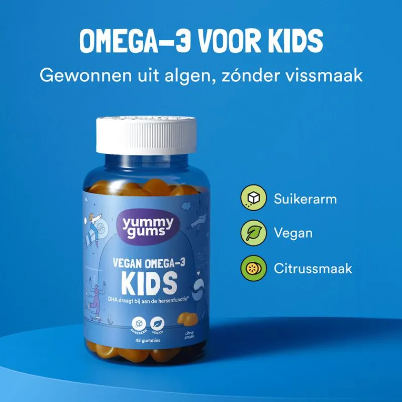 Yummygums Kids Omega-3 Vegan biedt een bron van het omega-3 vetzuur DHA, dat belangrijk is voor de normale ontwikkeling van de hersenen en het gezichtsvermogen van je kind. Dankzij de frisse citrus gummie. Yummygums Kids Omega-3 Vegan is plant-based en suikerarm.