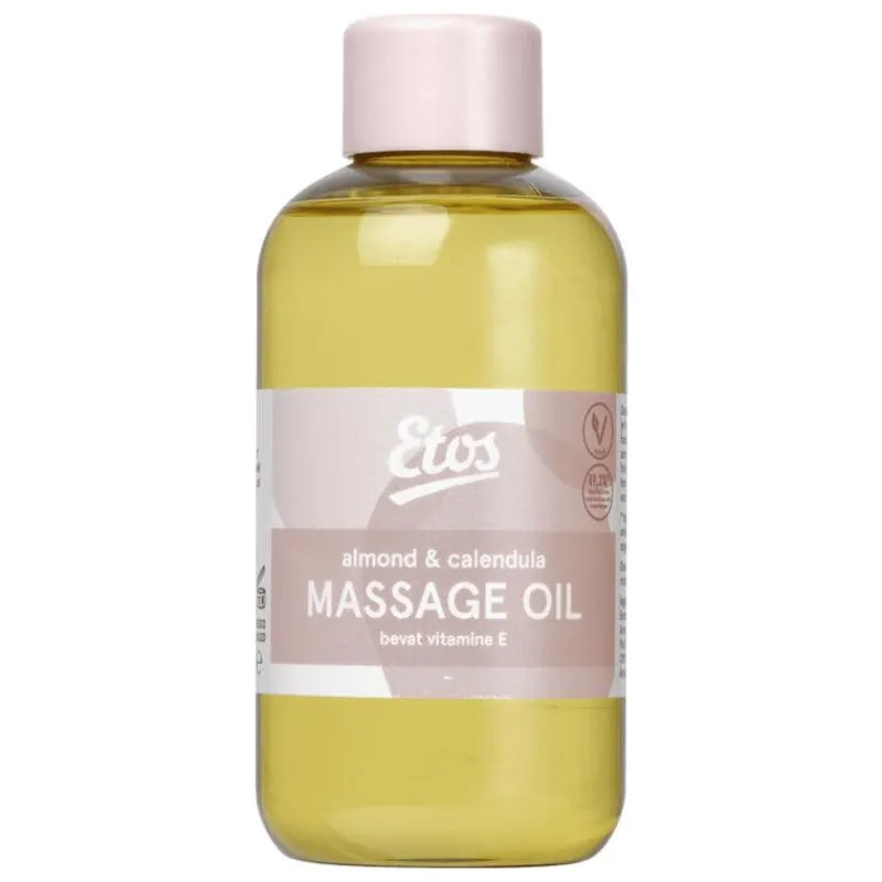 Etos Massage oil laat zich gemakkelijk over de huid verdelen, trekt langzaam in en geeft de huid eenfluweelzacht gevoel. De olie helpt de huid te hydrateren en ondersteunt het herstellend vermogen van de huid. Voor alle huidtypen.• Helpt hydrateren en maakt de huid glad en stralend• Intensieve verzorging• Trekt langzaam in • Voor alle huidtypen• Verrijkt met amandelolie en calendula • Bevat vitamine E Door een massage kom je weer even helemaal tot jezelf. Je lichaam ontspant en je voelt je daarna vaak als herboren. Dit komt o.a. omdat de aanmaak van endorfine (ook wel het gelukshormoon genoemd) en de aanmaak van oxytocine (ook wel bekend als het knuffelhormoon) worden gestimuleerd. Deze lichaamseigen stofjes verminderen stress en verhogen je geluksgevoel. Je spieren voelen na een massage weer soepel en ontspannen aan. Tip: Drink minimaal twee glazen water na een massage om de vrijgekomen afvalstoffen helpen af te voeren,.