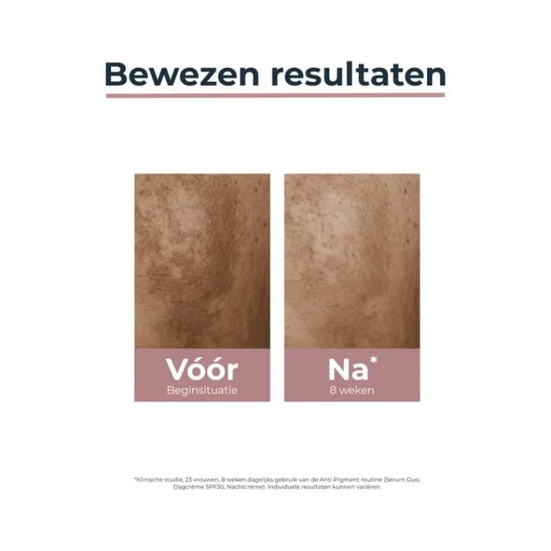 Melanine is een natuurlijk pigment dat de kleur van de huid bepaalt. Blootstelling aan de zon, hormonale factoren (zoals zwangerschap en menopauze) en huidveroudering kunnen leiden tot een toename van de aanmaak van melanine en hyperpigmentatie veroorzaken. Hyperpigmentatie verschijnt in de vorm van donkere vlekken, pigmentvlekken of ouderdomsvlekken (ook wel zonnevlekken genoemd) en geeft de huid een onregelmatig uiterlijk. De Anti-Pigment Dagcrème SPF 30 bevat Thiamidol, een effectief en gepatenteerd actief ingrediënt* dat werkt op de bron van hyperpigmentatie door te helpen de productie van melanine in evenwicht te brengen. Klinische en dermatologische studies hebben bewezen dat de Dagcrème donkere vlekken vermindert en helpt de terugkeer ervan te voorkomen. Eerste zichtbare resultaten na 2 weken en continue verbetering bij regelmatig gebruik.** De UVA- en UVB-filters (SPF 30) in de hydraterende dagcrème zorgen voor een effectieve zonnebescherming en verminderen het risico op vorming van pigmentvlekken door de zon. De huid ziet er egaal en stralend uit. *Gepatenteerd Thiamidol (EP 2 758 381 B1), Frankrijk, België, Nederland **Klinische score gerealiseerd op 32 personen