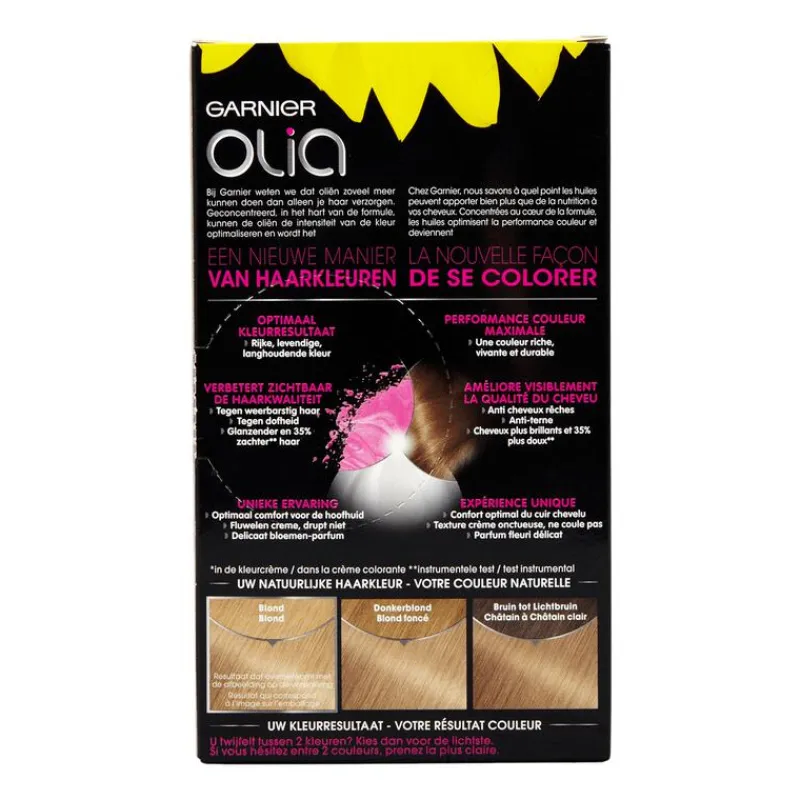 Garnier Olia is een permanente haarkleuring op basis van oliën, biedt tot 100% grijsdekking zonder ammoniak voor een aangename geur. Door de mix van oliën met natuurlijke bloemen die zijn toegevoegd aan de kleurcrème, dringen de kleurpigmenten tot dieper in je haar. Dit zorgt voor optimaal resultaat en zichtbare verbetering van haarkwaliteit. De verpakking bevat kleurcrème, ontwikkelcrème, nabehandeling, handschoenen en gebruiksaanwijzing. De fluweelzachte textuur maakt thuisapplicatie eenvoudig, terwijl de nabehandeling zonder siliconen het haar natuurlijk laat aanvoelen, met langdurige glans en verzorging.