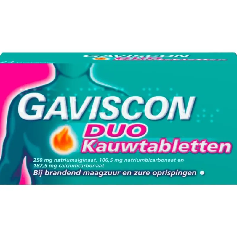 Gaviscon Duo kauwtabletten zijn werkzaam bij brandend maagzuur en zure oprispingen.Dosering enwijze van gebruik: volwassenen en kinderen ouder dan 12 jaar: 2 tot 4 tabletten na de maaltijden en voor het slapengaan, of volgens de instructies van uw arts, tot maximaal 4 keer per dag. Kinderen jonger dan 12 jaar: uitsluitend gebruiken volgens medisch advies. Voor oraal gebuik. Goed kauwen voor slikken.Voor gebruik de bijsluiter lezen.Elk tablet bevat 250 mg natriumalginaat, 106, 5 mg natriumbicarbonaat en 187,5 mg calciumcarbonaat. Bevat aspartaam (E951) als zoetstof, dat een bron van fenylalanine is.Mensen met fenylketonurie dienen hier rekening mee te houden. Bevat karmozijnrood (E122). Neem contact op met uw arts als u na 7 dagen nog steeds klachten heeft. Bevat natrium en calcium. Overleg voor gebruik met uw arts wanneer u een zoutarm en/of calciumarm dieet volgt. Hoog in natrium – zie bijsluiter voor meer informatie