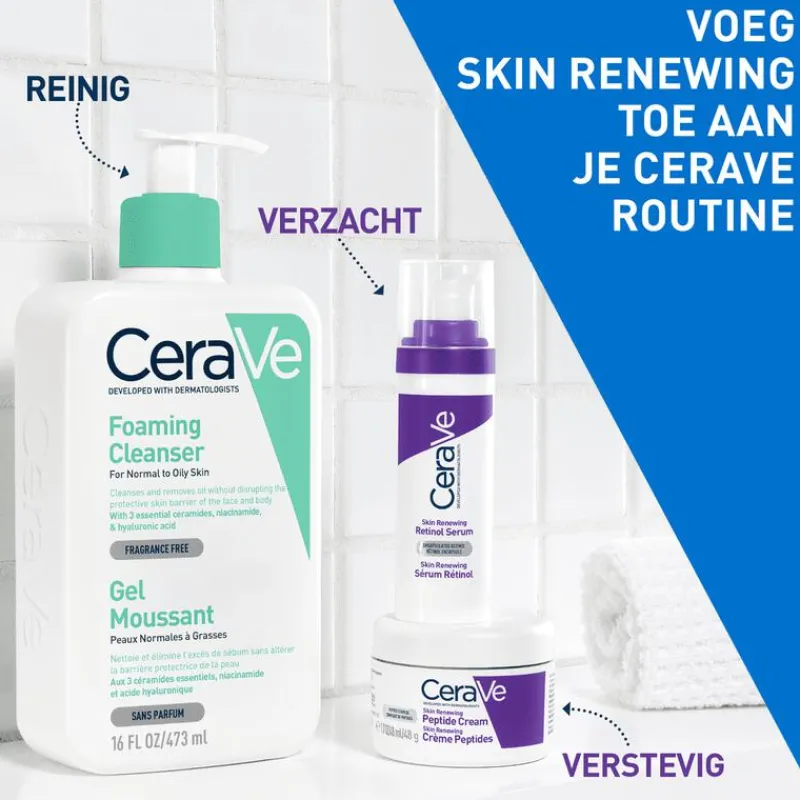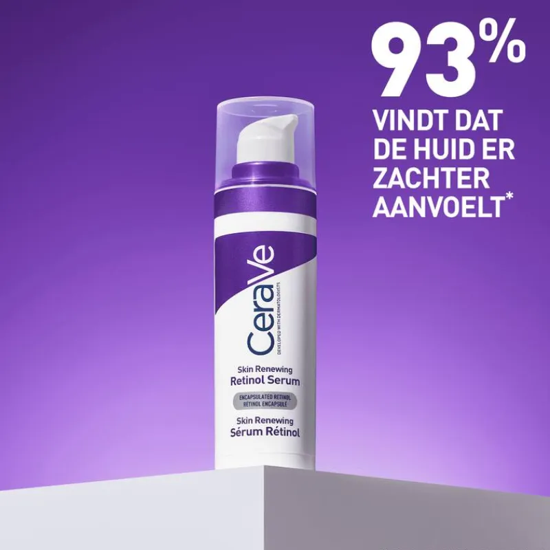 Het CeraVe Skin Renewing Retinol Serum is een mild maar effectief gezichtsserum geschikt voor alle huidtypes, zelfs een gevoelige huid. De formule bevat ingekapselde retinol die fijne lijntjes en rimpels vervaagt, terwijl de 3 essentiële ceramiden de natuurlijke huidbarrière helpen herstellen en ondersteunen. Tegelijkertijd zorgt de gepatenteerde MVE-technologie voor langdurige hydratatie de hele dag dankzij een continue afgifte van actieve bestanddelen. Tekenen van huidveroudering worden vervaagd, waardoor de huid er zichtbaar gladder en jonger uitziet. CeraVe Skin Renewing Retinol Serum is ontwikkeld in samenwerking met dermatologen en is niet-comedogeen, waardoor het ideaal is voor een gevoelige huid. De lichte, vloeibare textuur zonder parfum voelt comfortabel aan op de huid. Het serum biedt een effectieve anti-aging verzorging met een optimale tolerantie. Voeg CeraVe Skin Renewing Retinol Serum toe aan je dagelijkse je huidverzorgingsroutine, voor een gevoede en gladde huid die langdurig gehydrateerd blijft.