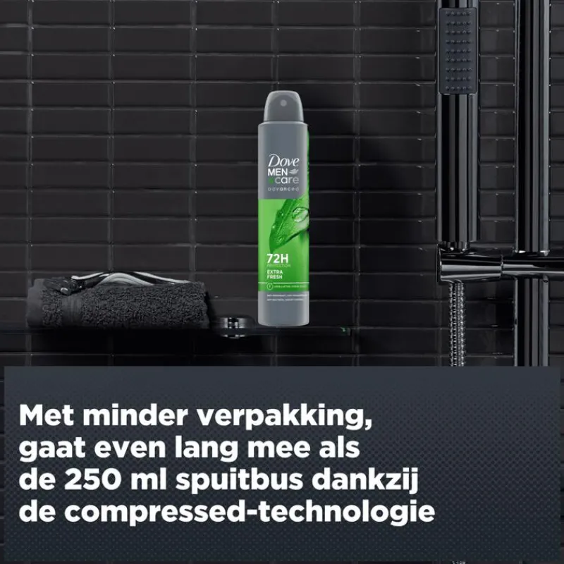 Dove Men+Care Advanced Extra Fresh Anti-Transpirant Deodorant Spray met Triple Action Technologie beschermt tot wel 72 uur tegen zweet en verzorgt je huid. De verbeterde formule met antibacteriële geurbestrijding voorkomt nare geurtjes. De 1/4 vochtinbrengende crème beschermt je okselhuid tegen irritatie door zweet en scheren. Je krijgt een gehydrateerde en beschermde huid en gladde, comfortabel aanvoelende oksels. Dove Men+Care Advanced Extra Fresh Anti-Transpirant Deodorant Spray helpt je er op je best uit te zien en je op je best te voelen. De semicompressed-spuitbus van 200 ml gaat even lang mee als de gewone versie van 250 ml. Bovendien zorgt onze compressed-technologie ervoor dat onze deodorants hun gas langzaam afgeven, waardoor ze ook milder zijn voor de huid.