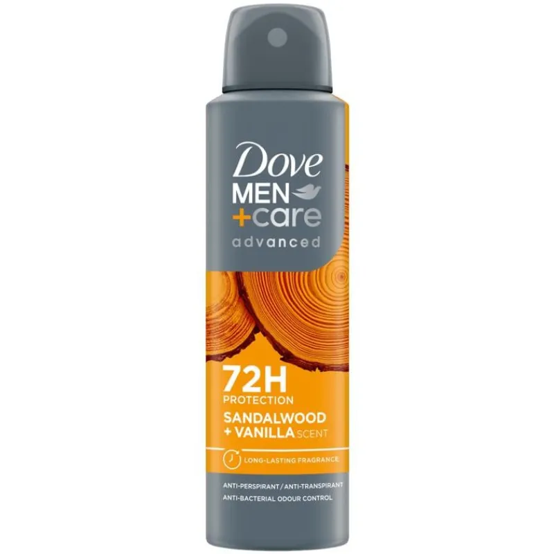 Dove Men+Care Advanced Sandalwood + Vanilla Anti-Transpirant Deodorant Spray met anti-bacteriële geurbestrijding beschermt tot 72 uur lang tegen zweet en nare geurtjes en heeft een heerlijk frisse geur voor langdurig fris ruikende oksels. Deze Dove Men+Care anti-transpirant met 1/4 hydraterende crème verzorgt de okselhuid, zo behoren irritaties door zweet en scheren tot het verleden. Je krijgt een gehydrateerde en beschermde huid en gladde, comfortabel aanvoelende oksels.