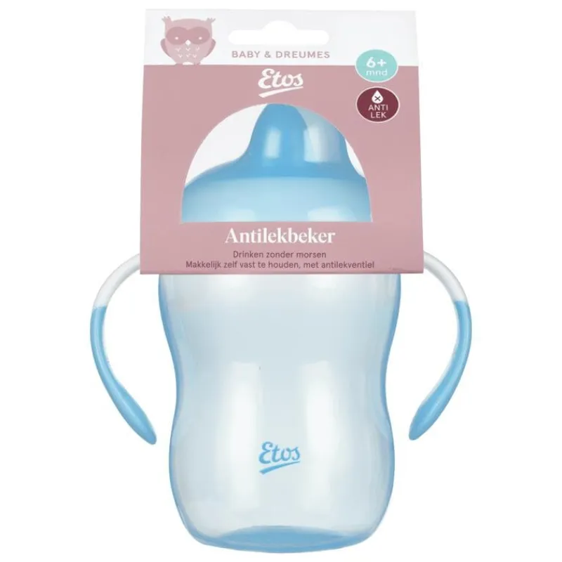 Deze antilekbeker van Etos doet wat hij belooft; hij lekt niet. Het knappe antilekventiel voorkomt elke lekkage. De tuit wordt beschermd door een kapje voor goede hygiëne.
