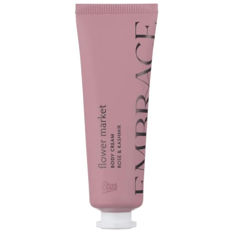 De Etos Embrace Body Cream Mini Flower Market is een rijke en hydraterende bodycrème met sheaboter, cacaoboter en kokosnootolie. De noten van roos en kasjmier geven deze showergel de geur van bloeiende boeketten vol met liefde.