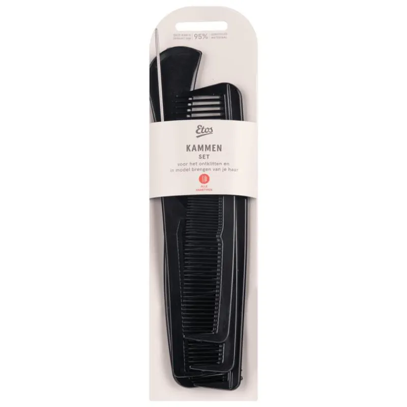 De Etos kammenset bevat vijf verschillende kammen, ideaal voor uiteenlopende haarstijlen en haartypes. Of je nu een fijne kam nodig hebt voor precisiewerk of een grove kam om volume te creëren, met deze set ben je altijd goed voorbereid.