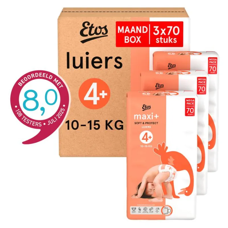 Ontdek de Etos Maxi+ Luiers in Maat 4+, de ideale keuze voor ouders die op zoek zijn naar comfort en bescherming voor hun kleintje. Deze maandbox bevat maar liefst 240 luiers, verdeeld over drie verpakkingen van 80 stuks. Perfect voor baby’s met een gewicht van 10 tot 15 kg, biedt deze voordeelverpakking ultiem gemak voor een hele maand. De zachte en beschermende luiers zorgen ervoor dat je baby zich altijd comfortabel voelt, terwijl jij je geen zorgen hoeft te maken over lekken.