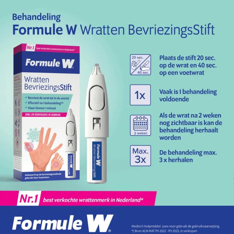 Wratjes op handen of voeten behandel je snel en effectief thuis met Formule W, het best verkochte wrattenmerk in Nederland*. Formule W Wratten BevriezingsStift is gebaseerd op de door huisartsen algemeen gebruikte bevriezingsmethode. Behandeld binnen 1 minuut Formule W Wratten BevriezingsStift is een medisch hulpmiddel. Snel en eenvoudig in gebruik Bevriest de wrat tot in de wortel Effectief na 1 behandeling Klaar binnen 1 minuut.