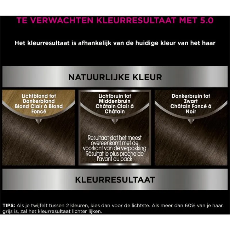 VOORZORGSMAATREGELEN HAARKLEURSTOFFEN KUNNEN ERNSTIGE ALLERGISCHE REACTIES VEROORZAKENLees en volg de instructies.Dit product is niet bestemd voor gebruik bij personen jonger dan 16 jaar.TIJDELIJKE TATOEAGES MET ZWARTE HENNA KUNNEN LEIDEN TOT EEN VERHOOGD RISICO OP EEN ALLERGISCHE REACTIE.Kleur uw haar niet als:• u last heeft van uitslag in het gezicht of van een gevoelige, geïrriteerde of beschadigde hoofdhuid• u eerder een reactie na een haarkleuring heeft gehad• u in het verleden een reactie heeft gehad na een tijdelijke tatoeage met zwarte hennaALLERGIE NEGEREN KAN LEVENSBEDREIGEND ZIJN Het is noodzakelijk een ALLERGIE WAARSCHUWINGSTEST 48 uur vóór iedere haarkleurbehandeling uit te voeren zelfs indien u al eerder een kleurproduct heeft gebruikt.Denk eraan het product 48 uur van te voren te kopen. (lees en volg de gebruiksaanwijzing). Bij een reactie of bij twijfel, raadpleeg een arts voordat u een kleurproduct gebruikt.”De ontwikkelvloeistof’’ bevat waterstofperoxide.“Het kleurproduct”a bevat: fenyleendiaminen, resorcinol, fenyleendiaminen (tolueendiaminen), ammoniak.• Bijgevoegde handschoenen dragen.• Contact van het product met de ogen vermijden. Niet gebruiken voor het kleuren van wimpers of wenkbrauwen. • Bij contact van het product met de ogen onmiddellijk met overvloedig water spoelen • Spoel het haar na de inwerktijd van het product goed uit.Wacht 2 weken na een permanent of een behandeling met een duurzaam gladmakend product.Niet gebruiken als uw haar gekleurd is met henna of een progressieve kleuring. Buiten bereik van kinderen houden.VOLG DE GEBRUIKSAANWIJZING Raadpleeg de ingrediëntenlijst onder dit kader.