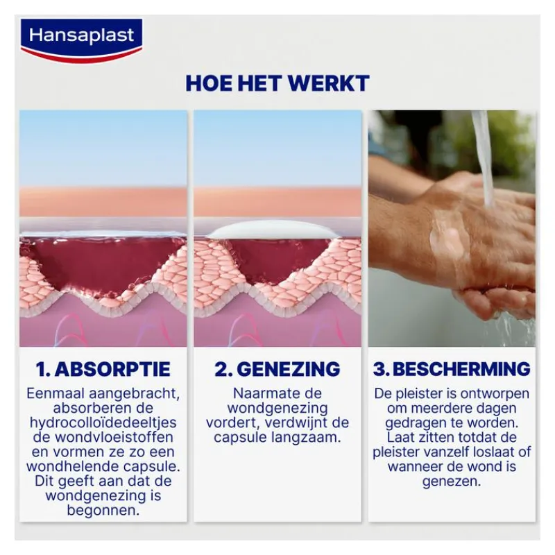 - WONDPLEISTER VOOR SNELLERE GENEZING: De hydrocolloïde pleisters bevorderen een snellere genezing door de helende capsuletechnologie. Het wondverzorging creëert een vochtige omgeving voor een optimale genezing.