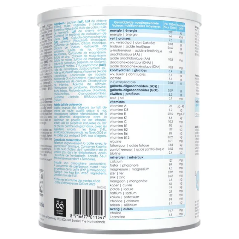 Kabrita combineert de natuurlijke eigenschappen van geitenmelk, zoals de milde smaak, met de beste ingrediënten zoals melkvet, verrijkende HMO 2’-FL, BB-12 probiotica, GOS:FOS vezels en DHA omega-3-vetzuren van algen.