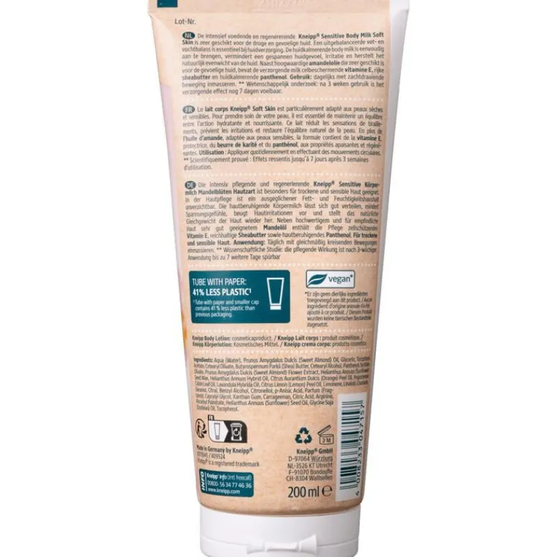 De intensief voedende en regenererende Kneipp® Sensitive Body Milk Soft Skin is zeer geschikt voor de droge en gevoelige huid. Een uitgebalanceerde vet- en vochtbalans is essentieel bij huidverzorging. De huidkalmerende body milk is eenvoudig aan te brengen, vermindert een gespannen huidgevoel, irritatie en herstelt het natuurlijk evenwicht van de huid. Naast hoogwaardige amandelolie die zeer geschikt is voor de gevoelige huid, bevat de verzorgende milk celbeschermende vitamine E, rijke sheabutter en huidkalmerende panthenol. ** Wetenschappelijk onderzoek: na 3 weken gebruik is het verzorgende effect nog 7 dagen voelbaar.