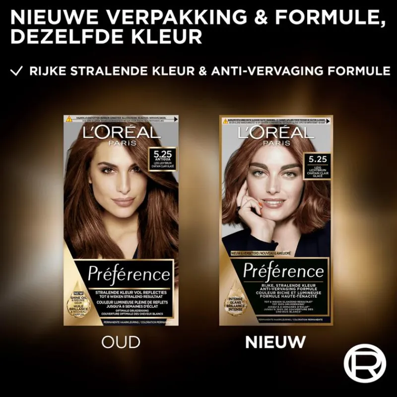 L’Oréal Paris Préférence is een permanente haarkleuring met tot 100% grijsdekking. De kleuring resulteert in een natuurlijke, stralende kleur met reflecties en langdurige glans. De verpakking bevat 5 componenten: kleurgel, ontwikkelcrème, glansbeschermende conditioner, handschoenen en gebruiksaanwijzing. De formule van Préférence bevat een UV-filter voor bescherming tegen zoninvloeden en Vitamine E ter ondersteuning van de haarkwaliteit. De glansbeschermende conditioner kan wekelijks worden gebruikt om de glans in het haar langer te behouden.