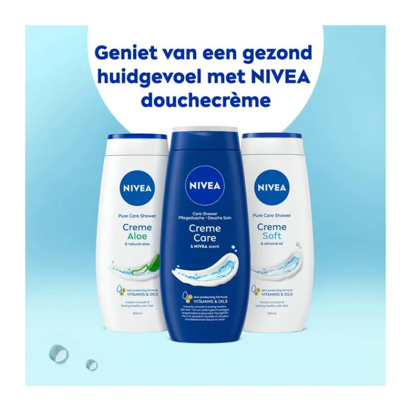 Ervaar iedere dag een moment van verzorging met de NIVEA Creme Care Douchecrème. Deze milde formule, verrijkt met ingrediënten van de originele NIVEA Creme, hydrateert intensief en geeft je huid een zacht, verzorgd gevoel. De douchecrème is pH-huidneutraal, dermatologisch goedgekeurd en respecteert het microbioom van de huid. Dankzij de 99% biologisch afbreekbare formule* is het ook een duurzame keuze. Ideaal voor alle huidtypes. Breng aan op de natte huid, masseer zacht in en spoel af voor een zichtbaar gehydrateerde huid – elke dag opnieuw.