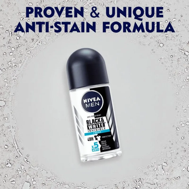 NIVEA MEN Black & White Invisible biedt bescherming tegen witte vlekken op zwarte kleding en tegen gele vlekken op witte kleding dankzij de unieke gepatenteerde anti-vlekken technologie. Het biedt betrouwbare 72 uur anti-transpirantbescherming, krachtig tegen zweet en geuren, en verzorgt je huid. De formules bevatten geen ethylalcohol. NIVEA Black & White biedt complete bescherming tegen zweet, geuren, vlekken, resten en irritaties, terwijl het zacht is voor de huid. Huidverdraagzaamheid dermatologisch bewezen. Onze anti-transpiranten bieden Derma 72u Active Protection: onze producten werken samen met de huid voor betrouwbare en krachtige werking tegen zweet en geur, met huidvriendelijke formules.