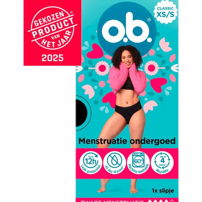 Ontdek het nieuwe O.B. herbruikbare menstruatie ondergoed voor vrouwen – jouw betrouwbare en vertrouwde partner tijdens je menstruatie. Dankzij de sterk absorberende kern en de unieke anti-lek barrières aan de zijkanten, biedt het tot 12 uur lang bescherming en droogheid. Het menstruatie broekje is voorzien van verschillende absorberende lagen en materialen die het bloed veilig en snel opnemen, terwijl lekken wordt voorkomen. Geniet tot wel 12 uur lang van een geurvrije en betrouwbare bescherming. Het FormFlex™ ontwerp past zich aan jouw lichaamsvorm aan en biedt een uiterst comfortabele en stevige pasvorm. Het voelt aan als normaal ondergoed en is geschikt voor elk lichaamstype. Bovendien is de toplaag van het menstruatie ondergoed gemaakt van 100% biologisch katoen, wat zorgt voor een zacht en ademend comfort en een langdurig droog gevoel. Het menstruatie broekje van O.B. vervangt tot wel 4 maandverbanden. Ook is het ondergoed herbruikbaar en eenvoudig te onderhouden na gebruik, waardoor je je menstruatie gemakkelijk kunt managen zonder regelmatig wegwerp maandverbanden te moeten kopen. Of je het nu ’s nachts of overdag gebruikt, de ademende, waterdichte laag helpt je zelfverzekerd te blijven door je te beschermen tegen hevige menstruatie en doorlekken, waar je ook bent. Dit product vermindert de hoeveelheid plastic afval met gemiddeld 85%* ten opzichte van maandverband, waardoor je een positieve bijdrage levert aan het milieu. Na elk gebruik spoel je het gewoon af met koud water en gooi je het menstruatie ondergoed in de wasmachine met je normale wasgoed, waarbij je het op 60°C wast. O.B.’s menstruatie broekje is herbruikbaar tot wel 4 jaar.