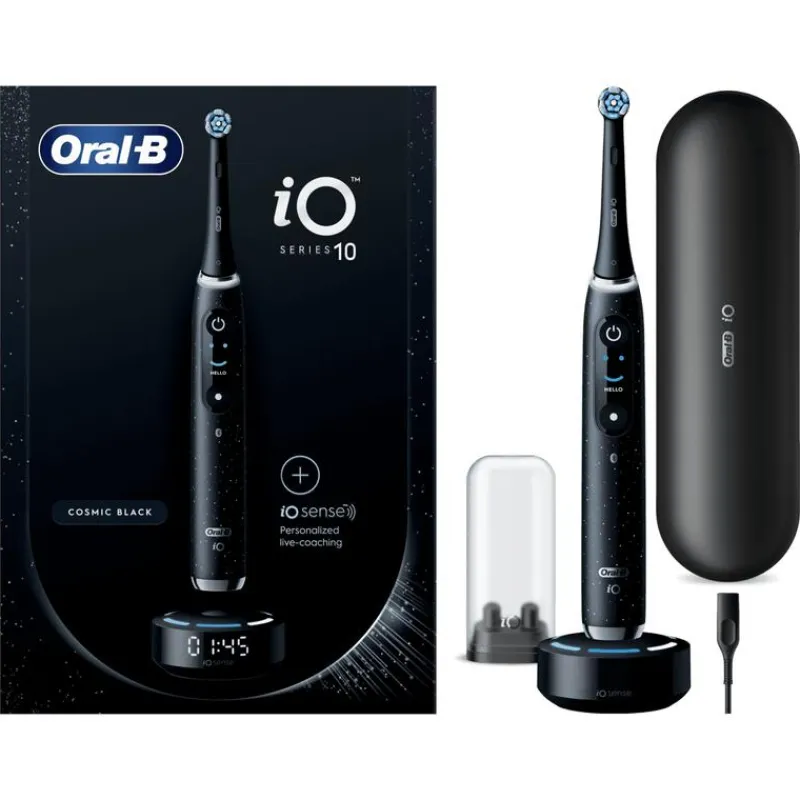 De iO 10 elektrische tandenborstel met de revolutionaire slimme iO Sense oplader personaliseert uw poetsstijl met realtime feedback, begeleidt u voor perfecte dekking, poetstijd en poetsdruk voor een heerlijk moeiteloze reiniging. Hij combineert zachte microtrillingen met een unieke, door tandartsen geïnspireerde ronde opzetborstel voor een professionele reiniging, elke dag. Vervang de Oral-B iO opzetborstel elke 3 maanden voor de beste resultaten.