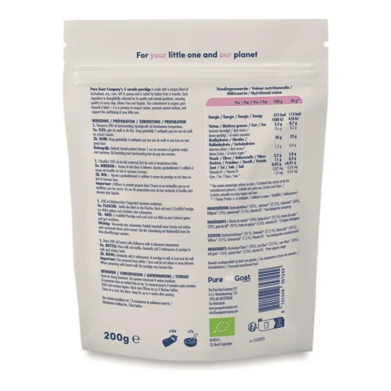 Pure Goat Company’s Bio Pap 5 Granen is een biologische glutenvrije meergranen pap, speciaal ontwikkeld voor baby’s vanaf 6 maanden en bevat een unieke mix van boekweit, rijst, maïs, teff en quinoa. De pap is eenvoudig te bereiden in combinatie met borstvoeding of Pure Goat opvolgmelk, en kan zowel als papfles of als papbordje worden geserveerd. Elk ingrediënt is zorgvuldig geselecteerd op kwaliteit en natuurlijke goedheid, om zo in elke stap topkwaliteit te garanderen. Onze toewijding aan biologisch gaat verder dan alleen een keurmerk – het is een belofte om de natuur te respecteren, dierenwelzijn te bevorderen en bij te dragen aan het welzijn van jouw kleintje. Goede tip Je kunt de pap of papfles ook met moedermelk bereiden.