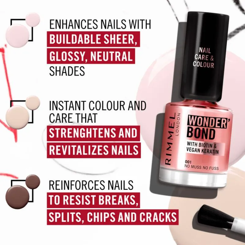 Geef je nagels wat ze verdienen met de Rimmel Wonder’ Bond-nagellak—het nieuwe 2-in-1 product dat je nagels kleurt en verzorgt. De formule met glossy finish is verrijkt met biotine, vegan keratine en arganolie om je nagels vanaf het eerste laagje te verstevigen, voeden en herstellen. Verkrijgbaar in een reeks transparante opbouwbare nudetinten, perfect voor een natuurlijke en cleane manicure.