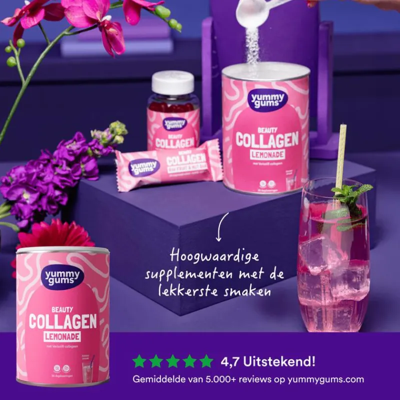 Met Yummygums Collagen Beauty Lemonade ondersteun je de huid van binnenuit (VERISOL® collageen). Dankzij de frisse bessensmaak drink je het met plezier. Hydrateren en suppleren, een win-win. Yummygums Collagen Lemonade is suikervrij.