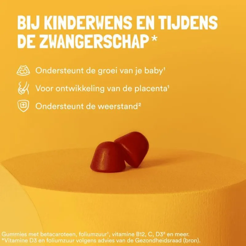 Bevat exact de juiste dosering foliumzuur en vitamine D3. Suikervrij. Bevat natuurlijke zoetstoffen.,Bij kinderwens, tijdens en na de zwangerschap. Deze speciaal afgestemde vitamine gummie ondersteunt jouw lichaam als mommy (to be). en draagt bij aan de ontwikkeling van je kleintje! Foliumzuur / 200%: Draagt bij aan de groei van je baby tijdens de zwangerschap en aan de vorming van de placenta. Ook voor vrouwen die zwanger willen worden. Vitamine D3 / 200%: Zorgt voor sterke botten en is belangrijk voor de ontwikkeling van de botaanmaak van jouw baby.