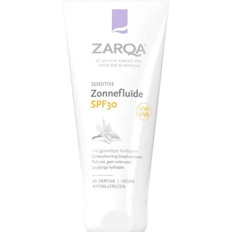 ZARQA Zonnefluïde SPF30 is dagelijkse zonbescherming met milieu- en huidvriendelijke zonnefilters voor zelfs de meest gevoelige huid. De broad-spectrum crème beschermt zowel tegen UVA- als UVB-straling en helpt beschermen tegen huidveroudering en zonnebrand. De fluïde bevat geen parfum en is verrijkt met panthenol voor langdurige hydratatie. Het krachtige anti-oxidant vitamine E beschermt de huid tegen schade door vrije radicalen. De fluïde heeft een aangename en lichtgewicht textuur die snel opgenomen wordt door de huid. Plakt niet en laat geen witte waas achter. Kan gebruikt worden bij een zon- en allergie-gevoelige huid en helpen bij het kalmeren van een geïrriteerde huid. Na gebruik is de (gevoelige) huid verzorgd en verzacht.