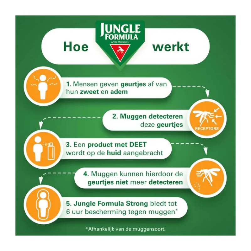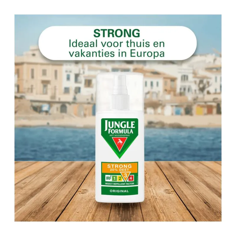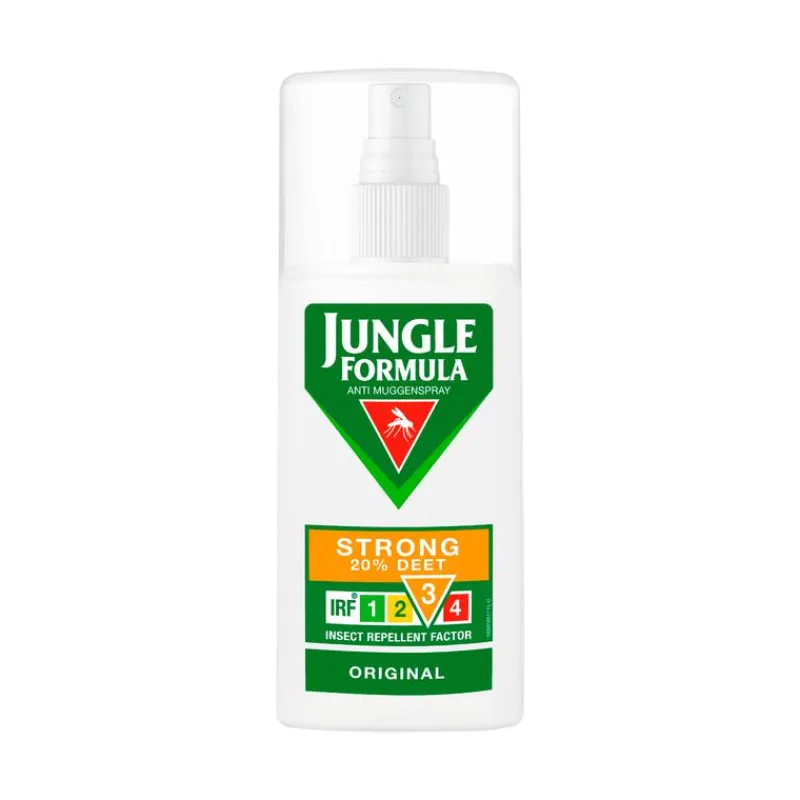 Jungle Formula Strong Original is een anti-insect spray met 20% DEET en plantenextracten voor een sterke bescherming. Deze muggenspray heeft een aangename geur en geeft wel 6 uur bescherming tegen muggen en andere stekende of bijtende insecten. Ideaal voor gebruik binnen- en buitenshuis & voor vakanties in Europa. Deze muggenbescherming is voor gebruik in gebieden zonder bekend risico op malaria of andere door insecten overdraagbare aandoeningen. Alle producten van Jungle Formula bevatten een IRF®. Hoe hoger de IRF®, hoe sterker de bescherming. Jungle Formula is er in IRF2, IRF3 en IRF4 varianten.