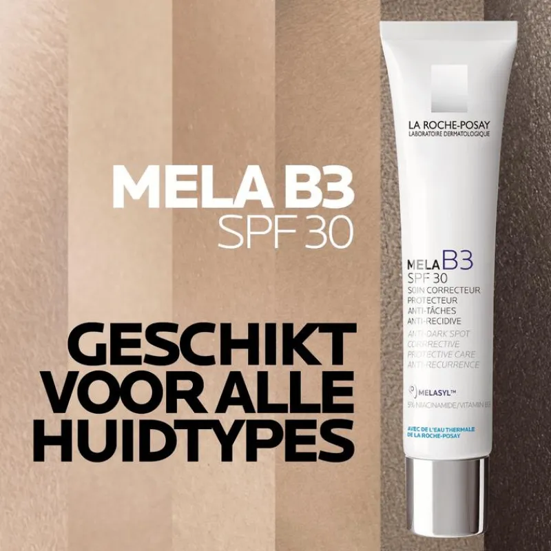 La Roche-Posay Mela B3 Crème SPF30 is een beschermende gezichtscrème tegen pigmentvlekken. Geschikt voor alle huidtypes, zelfs voor een gevoelige huid, en in het bijzonder voor de huid die gevoelig is voor pigmentvlekken. De formule is verrijkt met ons nieuwe revolutionaire gepatenteerde actieve ingrediënt Melasyl (dat overtollige melanine verwijdert voordat het de huid aantast) waardoor de crème pigmentvlekken helpt verminderen, hyperpigmentatie als gevolg van de zon helpt voorkomen en een egaliserende en verhelderende werking heeft. De Crème bevat 5% geconcentreerde niacinamide om de huid te kalmeren en de huidbarrière te versterken, en thermaal bronwater van La Roche-Posay, dat op natuurlijke wijze hydrateert en verzacht.