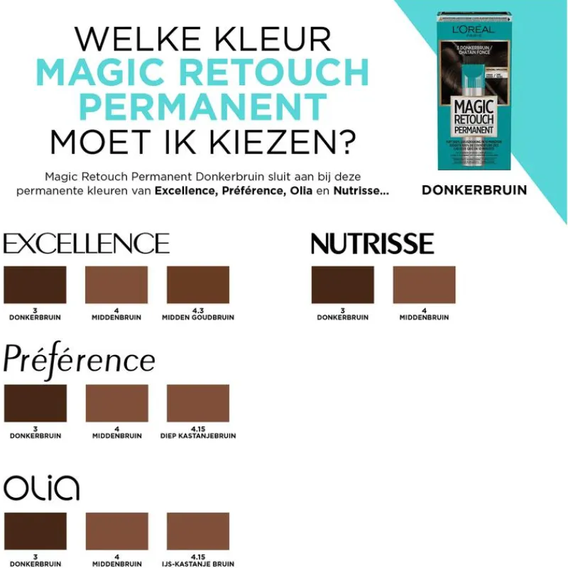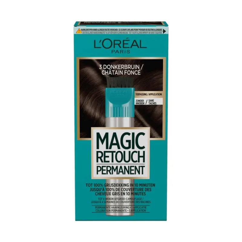 L’Oréal Paris Magic Retouch Permanent biedt een snelle oplossing tussen haarkleuringen – binnen 10 minuten kan deze permanente haarkleuring tot 100% van je grijze haren dekken. Eenmaal gedekt, blijft je uitgroei tot 4 weken gecamoufleerd. Het kleurmengsel maak je eenvoudig zelf met behulp van de componenten die je in de verpakking vindt. Het gaat hierbij om een kleurgel, een ontwikkelcrème, een zachte borstel, een nauwkeurige applicatiepunt en een paar handschoenen. De kleine flacon kleurgel giet je in de aanbrengflacon waar de ontwikkelcrème al in zit. Schud de aanbrengflacon vervolgens goed, om een egaal kleurmengsel te verkrijgen. Voordat je begint met aanbrengen kun je kiezen tussen twee verschillende applicatie opzetstukken: de Zachte Borstel of de Nauwkeurige Applicatiepunt. De Zachte Borstel is bedoeld voor gemakkelijke verdeling over de uitgroei en de Nauwkeurige Applicatiepunt juist voor nauwkeurige applicatie op de uitgroei. Deze twee opzetstukken zijn allebei ontwikkeld om de haarkleuring makkelijker met jouw haar te laten mengen zonder te knoeien. Heb je je opzetstuk gekozen? Dan kun je direct aan de slag gaan met de applicatie! Na het kleuren kun je genieten van een natuurlijk kleurresultaat. De haarkleuring mengt met jouw huidige haarkleur waardoor de kleur goed aansluit en natuurlijk oogt.