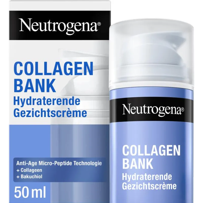 Neutrogena Collagen Bank Hydraterende Gezichtscrème helpt de huid stevig en soepel te houden door het natuurlijke collageen te beschermen en te ondersteunen. Vanaf je twintigste verlies je elk jaar tot 1% collageen*, wat kan leiden tot verminderde elasticiteit, een doffere teint en fijne lijntjes.