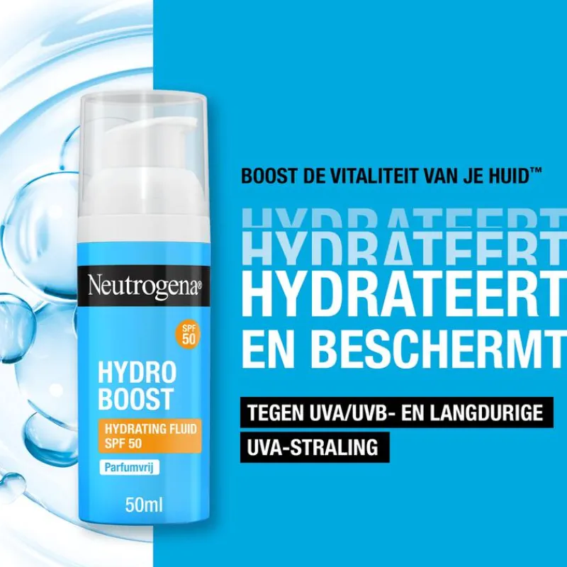- Klinisch bewezen hydratatie en bescherming: De Neutrogena® Hydro Boost Hydrating Fluid SPF 50 biedt langdurige, klinisch bewezen hydratatie met onmiddellijke resultaten na de eerste toepassing