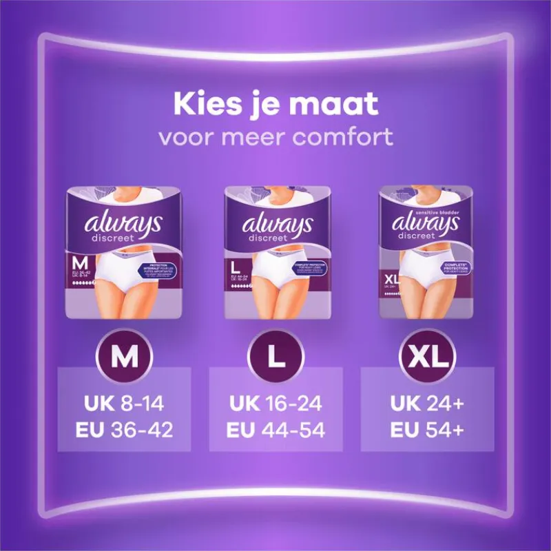 Laat incontinentie je er niet van weerhouden om actief te zijn. Met Always Discreet broekjes voor urineverlies Plus L kan jij volop van je dag genieten, zelfs bij veel urineverlies veroorzaakt door plotselinge aandrang. De superabsorberende broekjes zijn voorzien van RapidAbsorb technologie die urineverlies en geurtjes in enkele seconden helpt te absorberen en vast te houden. De dubbele LeakGuards beschermingsrandjes helpen lekken te vermijden daar waar ze het meeste voorkomen. Hun 360° FormFit-design en hun kern bieden een optimale en comfortabele pasvorm zodat je voluit van het leven kan genieten met een bescherming die je ongelooflijk goed past. Probeer Always Discreet broekjes voor urineverlies Plus L. Ook geschikt voor incontinentie na de bevalling. Ben je op zoek naar verschillende kleuren en optimale discretie? Kies dan Always Discreet Boutique broekjes, verkrijgbaar in zwart en beige.