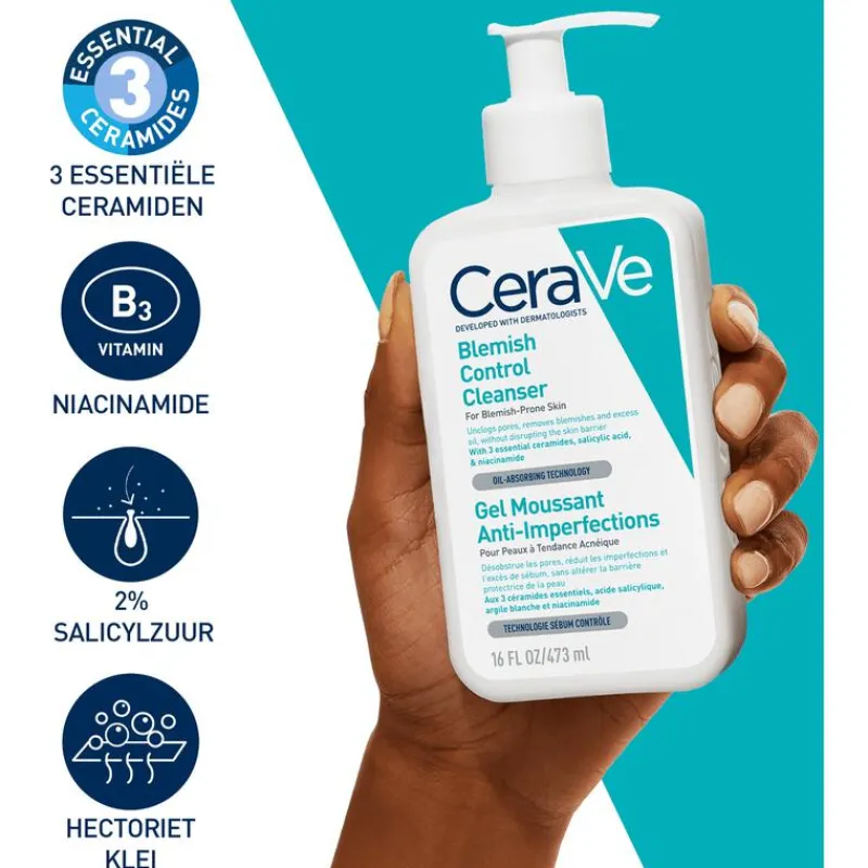 De CeraVe Anti-Onzuiverheden Reinigingsgel met 2% salicylzuur is geformuleerd om onzuiverheden te verwijderen, mee-eters te verminderen en de poriën te vernauwen, terwijl witte klei helpt overtollige talg te absorberen en het glimmen zichtbaar te verminderen. Deze schuimende reiniging, verrijkt met salicylzuur, verwijdert effectief onzuiverheden en overtollig talg, exfolieert zacht en dringt door in de verstopte poriën om toekomstige puistjes te helpen voorkomen. De reiniging bevat 3 essentiële ceramiden en niacinamide om de huid zacht en glad aan te laten voelen. De formule zonder parfum is niet-comedogeen en is ontwikkeld in samenwerking met dermatologen.